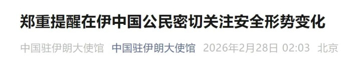 近日,伊朗面临外部安全风险显著上升,中国驻伊朗使领馆郑重提醒在伊中国公民密切关注安全形势变化,加强防范意识,切勿拍摄政府机构、军事设施等敏感场所,留意“禁止拍照”等标识,避免误拍、误入有关区域。有乘飞机旅行计划的人员随时注意航班信息。